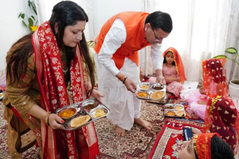 सीएम धामी ने पत्नी संग किया कन्या पूजन